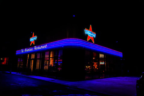 Ambiance Rock’n’Roll, néons, banquettes, carrelage à damiers, Juke box… chaque élément iconique des authentiques diners américains a été conservé dans une ambiance repensée.